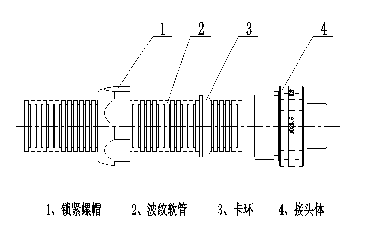 將軟管按照需要的長度切割,保證切面在軟管同一節(jié)距的凹槽內(nèi),且軟管突出部分的的端面基本平整,反之,需修整軟管。見圖2。將鎖緊螺帽套入軟管,再將卡環(huán)套入軟管規(guī)定凹槽內(nèi),WQGDM-M25B/AD28.5接頭連接普通AD28.5波紋軟管時,將卡環(huán)套入由右向左第6個卡槽內(nèi),見圖3。接頭體套入軟管后,僅需將鎖緊螺帽與接頭體螺紋旋緊即可安裝完成,且各項性能均能滿足要求。
