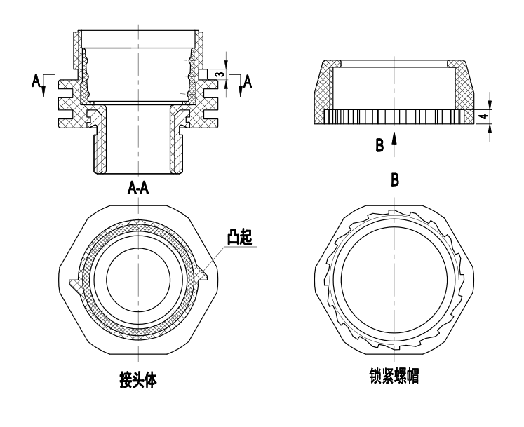 以WQGDM-M25B/AD28.5加強型高強度卡環(huán)式鎖緊防水軟管接頭為例,其設(shè)計如圖
