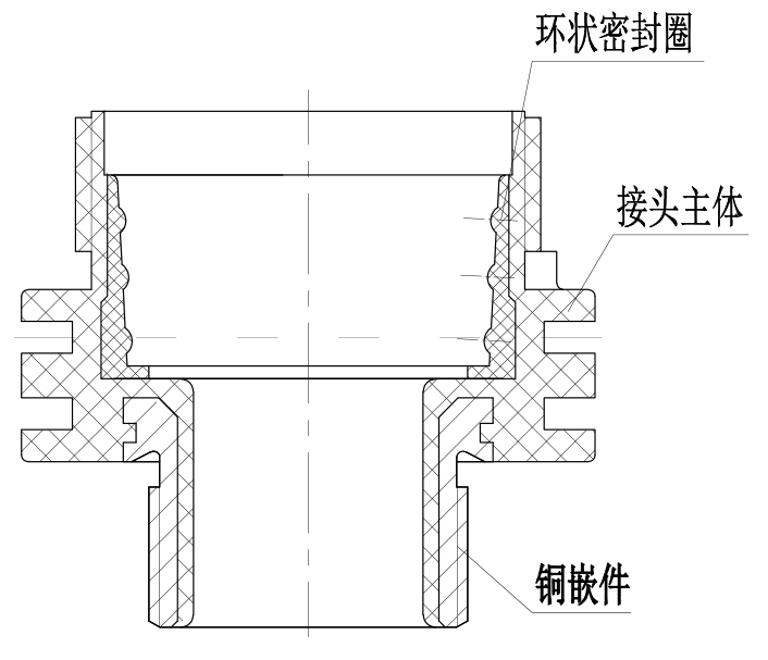 接頭體螺紋以金屬銅鑲件的形式,與接頭體一體注塑成型(即銅鑲件、接頭主體、環(huán)狀密封圈一體成型),見圖7。穿線孔部位(螺紋內(nèi)孔)需注塑包覆,表面達到光滑,更好的保護所穿線纜,同時金屬部分所占比例較小,有效減輕產(chǎn)品整體重量,而應(yīng)金屬螺紋部分較小,成本也等到有效控制。